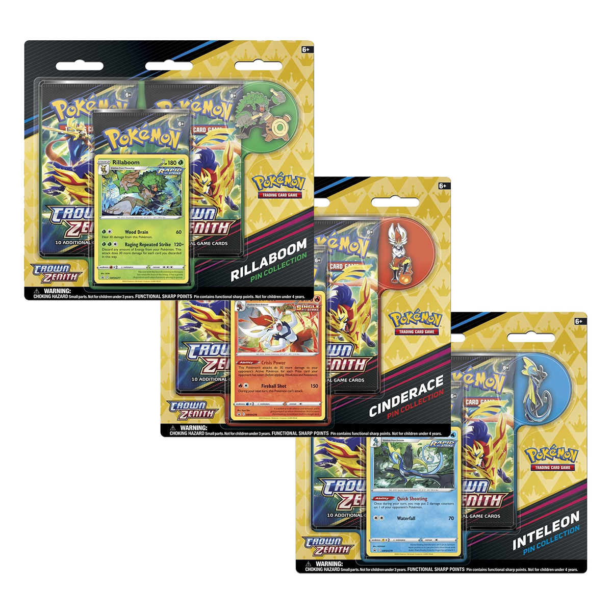 Blister de la colección Cenit Supremo con pin y carta holográfica. Aleatoria entre Cinderace, Rillaboom, Inteleon en español.